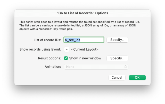 The GetRecordIDsFromFoundSet ( type ) and Go To List of Records functions are small but mighty additions that will become a staple in developer toolkits. It simplifies tracking, storing, and restoring user context with minimal scripting overhead. Whether you're building dashboards, task flows, or user-driven filters, this function brings newfound clarity and efficiency to your FileMaker solutions.